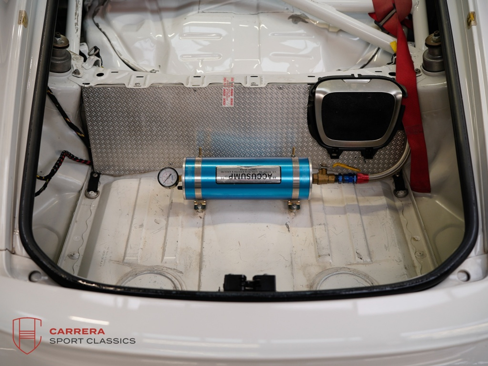 Het interieur werd volledig gestript en lichtgewicht uitgevoerd, met montage van carbon binnendeurpanelen en alle veiligheidsitems zoals voorgeschreven door artikel 253 van de FIA: rolkooi, kuipzetel, 6-punts gordels, brandblusser en noodstroomschakelaar.