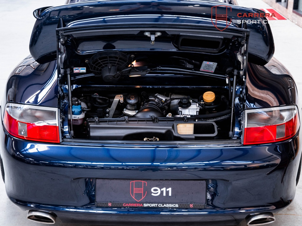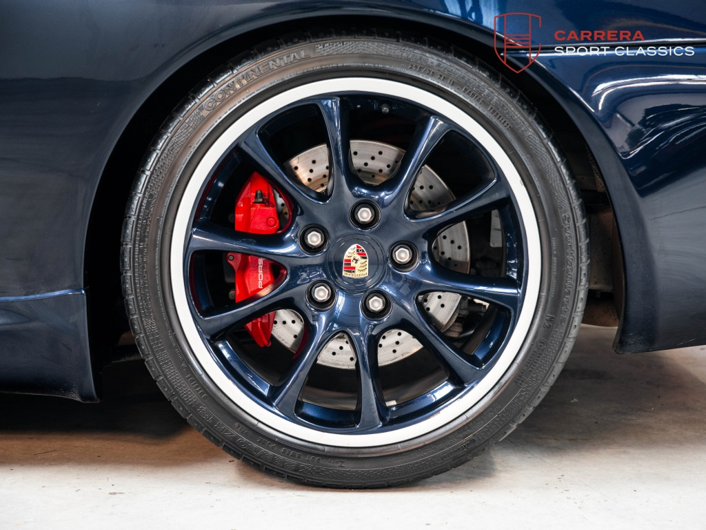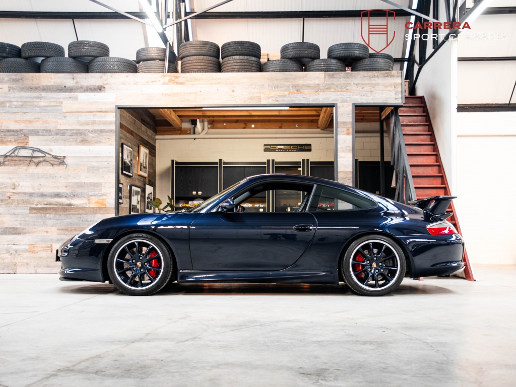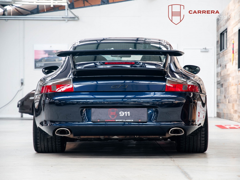 Uitgevoerd in het bijzonder elegante Midnight Blue Metallic (L39C) — een kleur die zelden voorkomt op een 996 GT3 — heeft deze wagen een zeer exclusieve en tijdloze uitstraling.