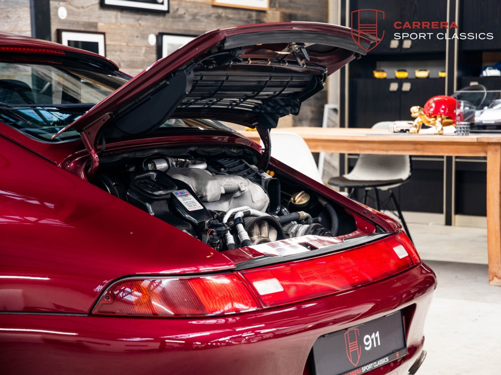 Afgewerkt in het iconische Arena Red Metallic (L84S) en gecombineerd met een volledig zwart lederen interieur, inclusief dashboard en deurpanelen, straalt deze wagen exact uit waar de 993 voor staat: tijdloze elegantie, technische verfijning en pure Porsche-identiteit.