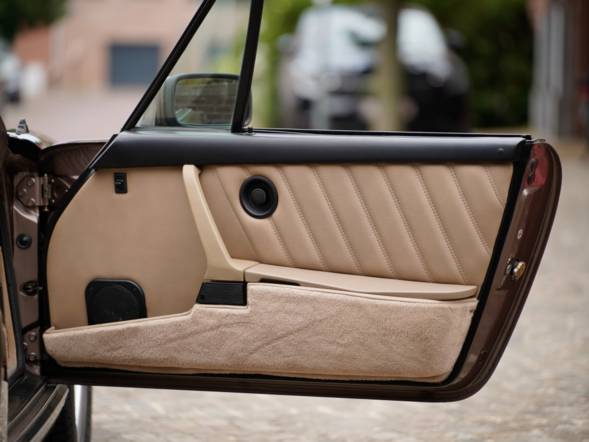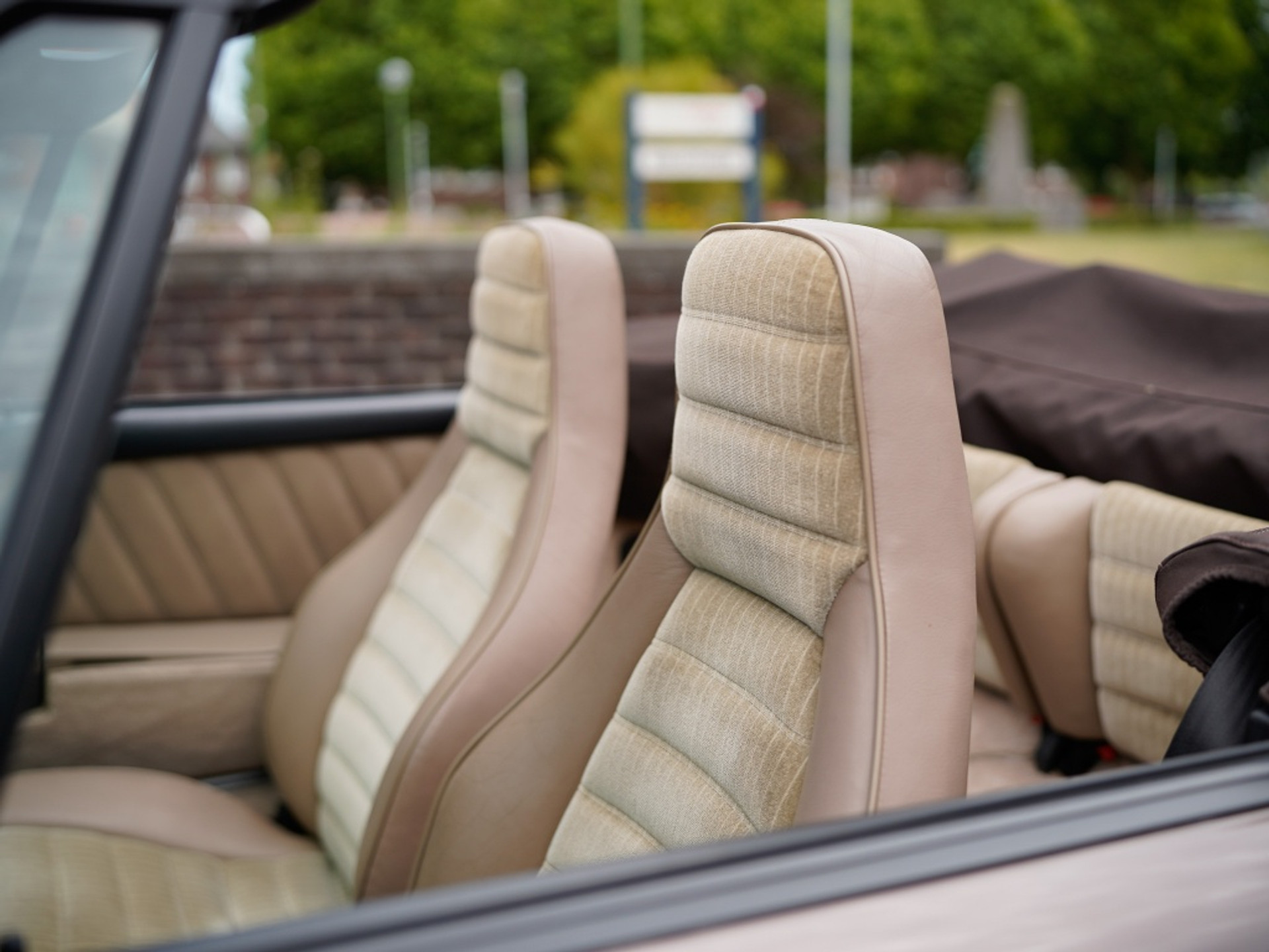 Het beige halflederen/velours interieur met witte strepen is in quasi onberispelijke staat en vertoont ondanks de lichte tapijten minimale gebruikssporen. Alles is origineel, zeer netjes en uitstekend onderhouden – een bewijs van de zorg die aan deze wagen werd besteed.