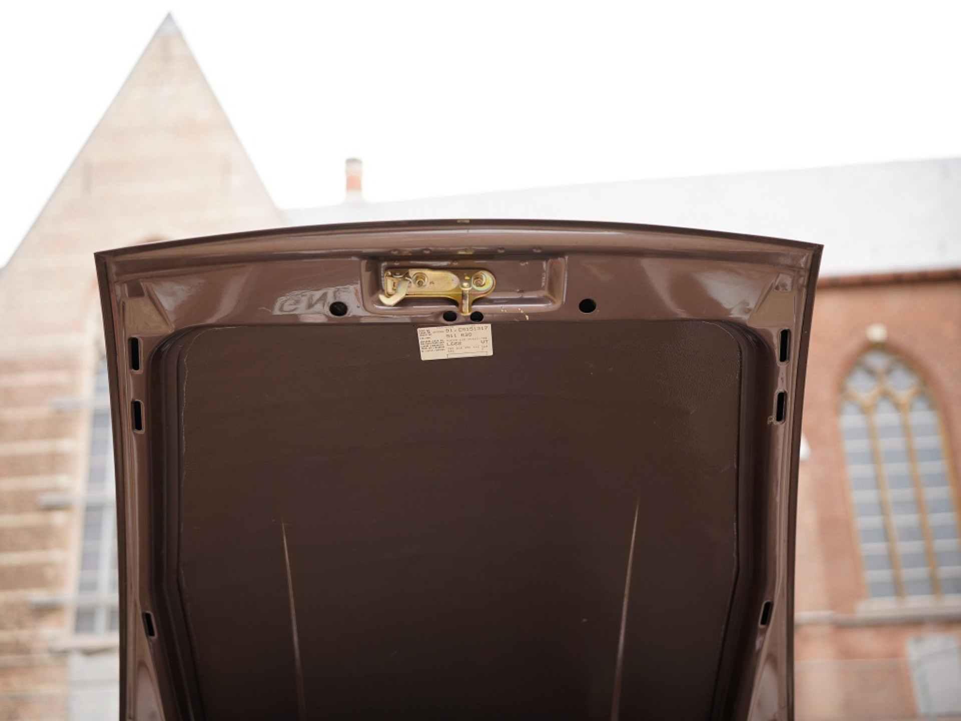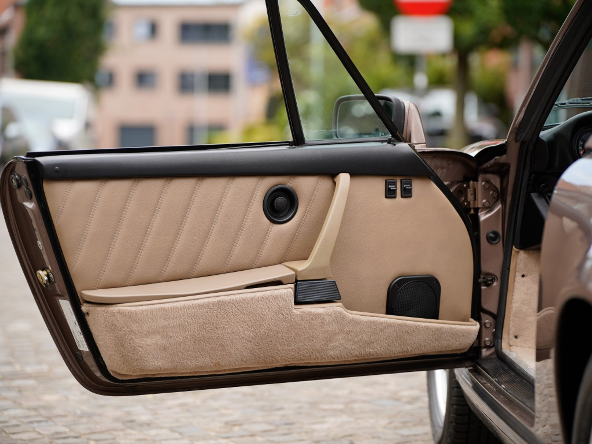 Het manueel bedienbare cabriodak in donkerbruin is in perfecte staat. De originele afdekhoes en bijhorende opbergtas zijn uiteraard ook aanwezig.